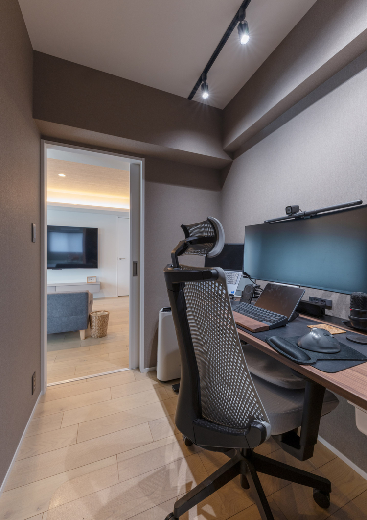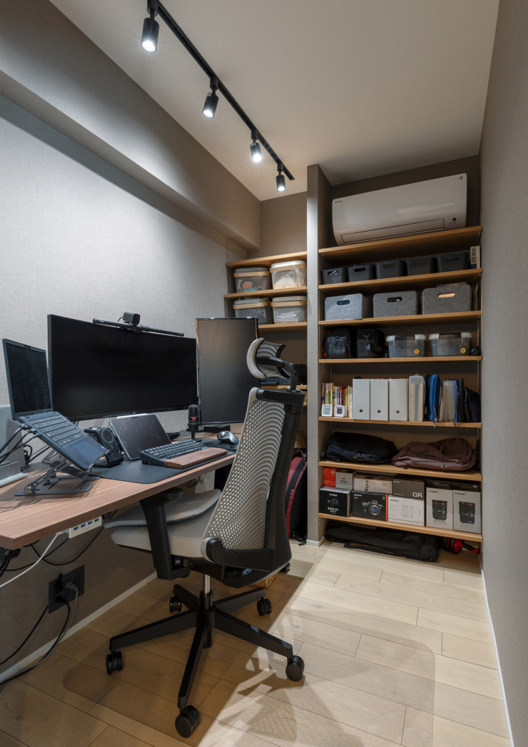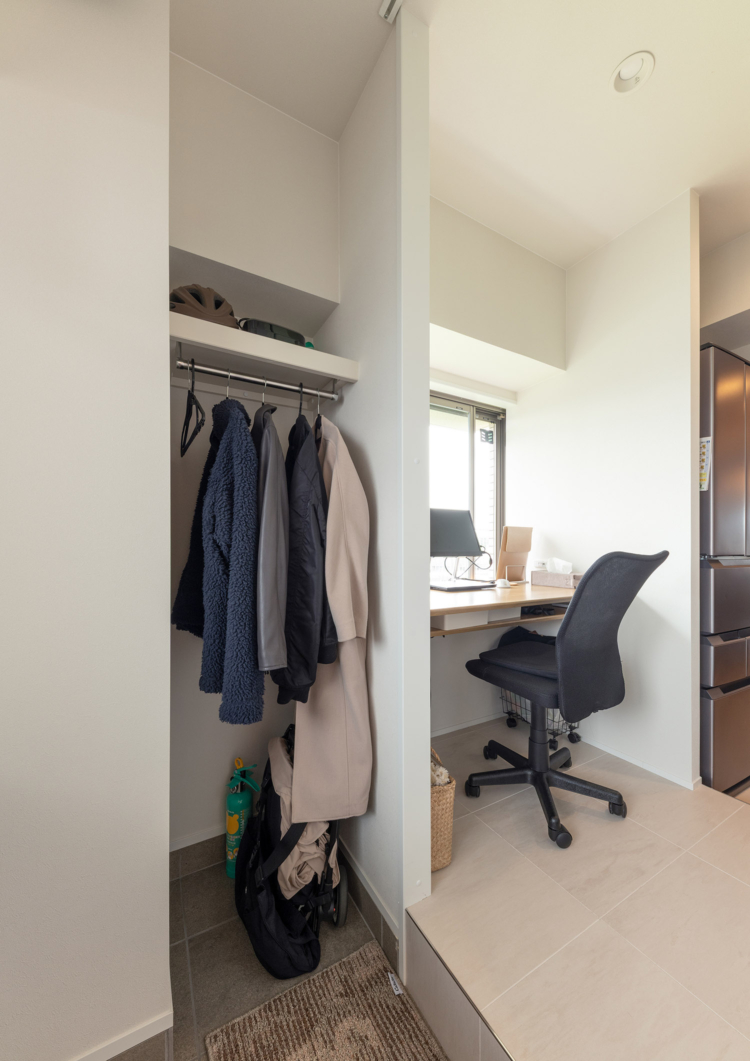 1つ目は、ご要望にあった書斎のひとつをパントリーと兼ねています。こちらは、奥様のワークスペースとなっており、家事時間の長いキッチンと近い場所に配置することで、隙間時間を効率的に活用できる空間になっています。