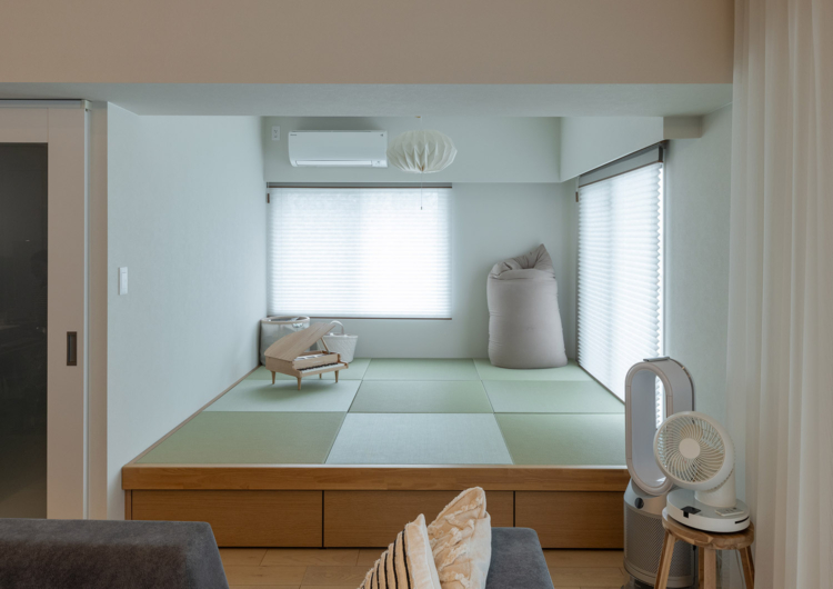 リノベーションで頂いたご要望は、小上がりとキッチンから全てを見渡せること、広いリビング、ご夫妻それぞれの書斎、買いだめ派のため収納力が高いながらも生活感が少ない空間づくりでした。また、共働きの子育て世帯のため、家事動線が良いことも希望されていました。