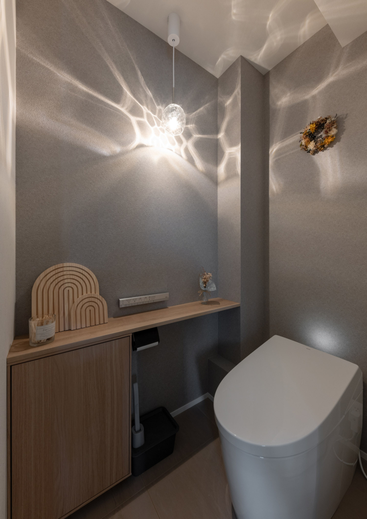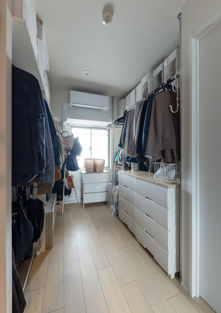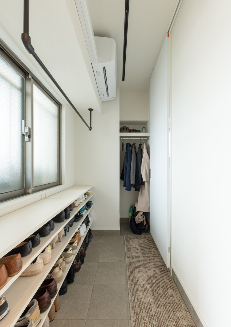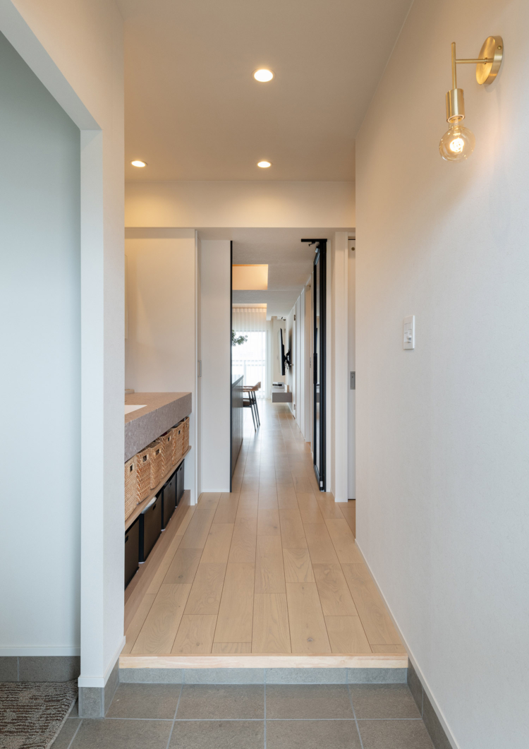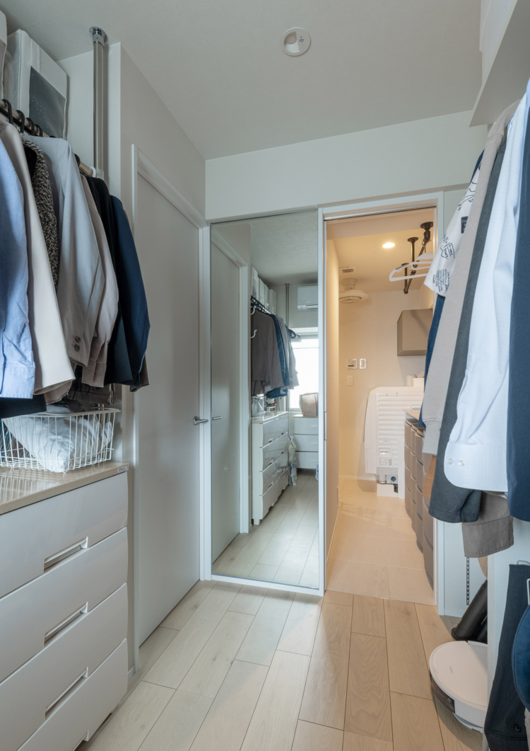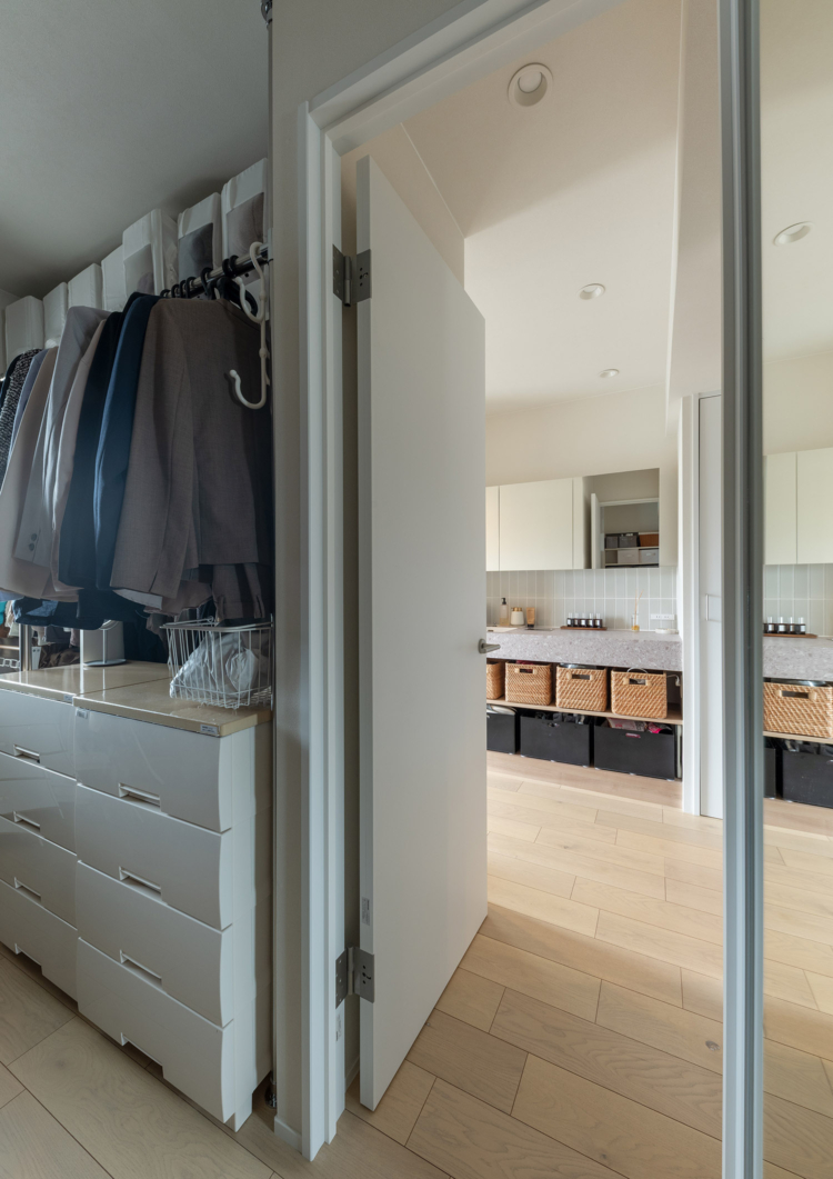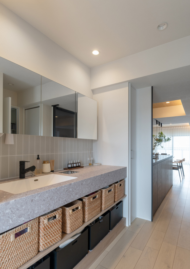 2つ目は、空間を独立させるのではなく玄関からLDKまでの廊下と兼ねた洗面所です。LDKまでの動線上に配置したことで、帰宅時にお子様が手洗い習慣を身に着けやすいだけでなく、横幅が広く大人2人が使う時間が被っても、ゆとりある空間になっています。