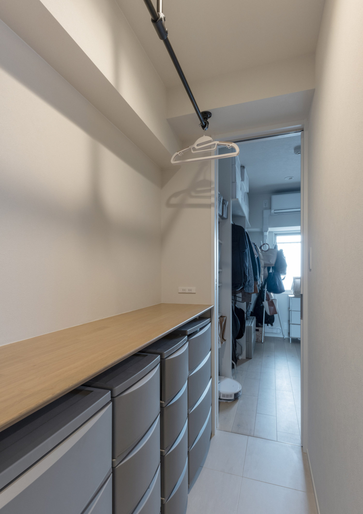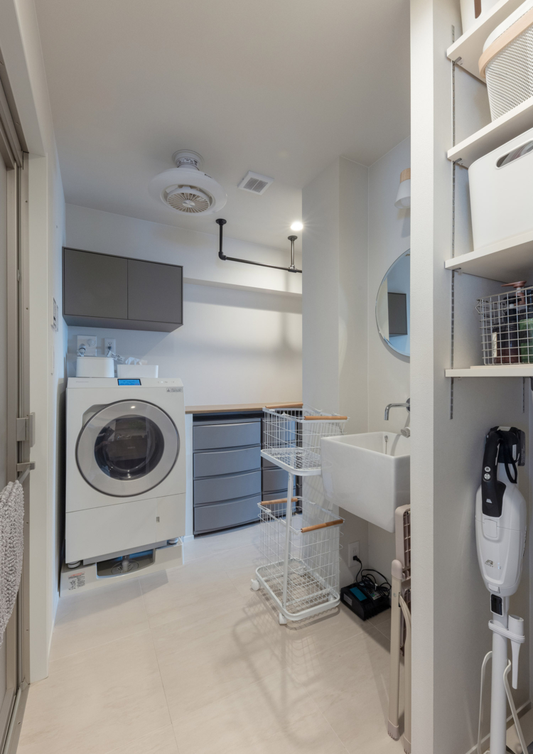 3つ目は、作業カウンターと洗面廻りの収納を兼ねたランドリールームです。洗濯機横に作業カウンターを配置し、カウンター下が収納になっています。洗濯を洗う・干す・仕舞うを短い動線で出来るだけでなく、アイロンも1か所で完結できる空間になっています。また、同じ空間内にスロップシンクもあり、付け置き洗いが必要な場合も、この場所できるようになっています。