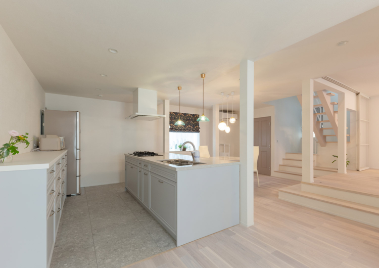 空間を分断していた階段は、端に寄せて柱や壁が少ないオープン階段に架け替えをしたことで、LDKが一体的な広々とした空間になっています。ご夫妻ともにお料理を楽しまれることから、こだわられたCUCINA(クチーナ)のアイランドキッチンは、作業しながらLDK全体を見渡すことが出来き、ご家族と会話が弾む空間になっています。