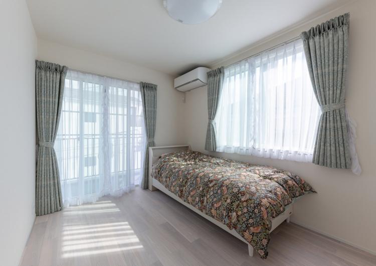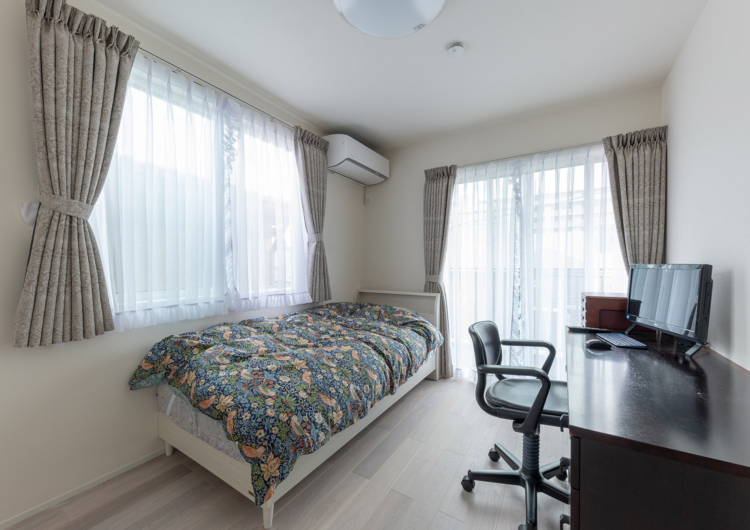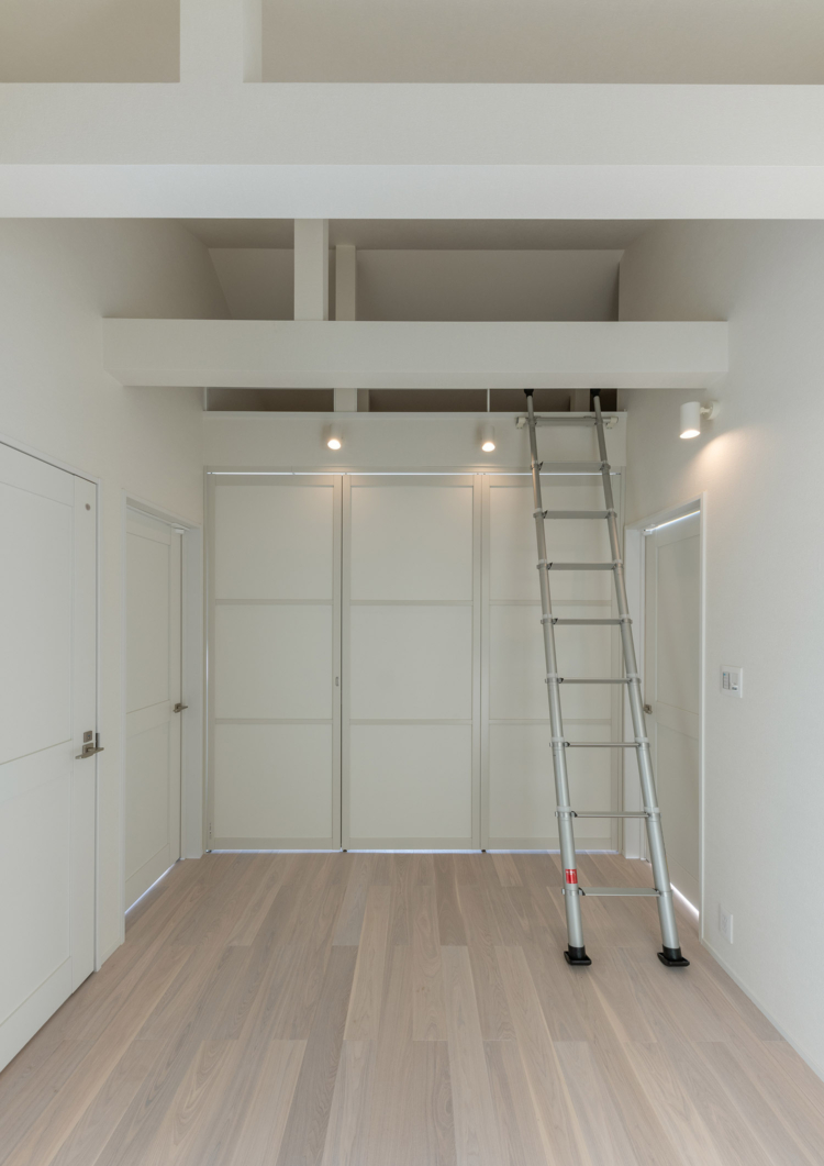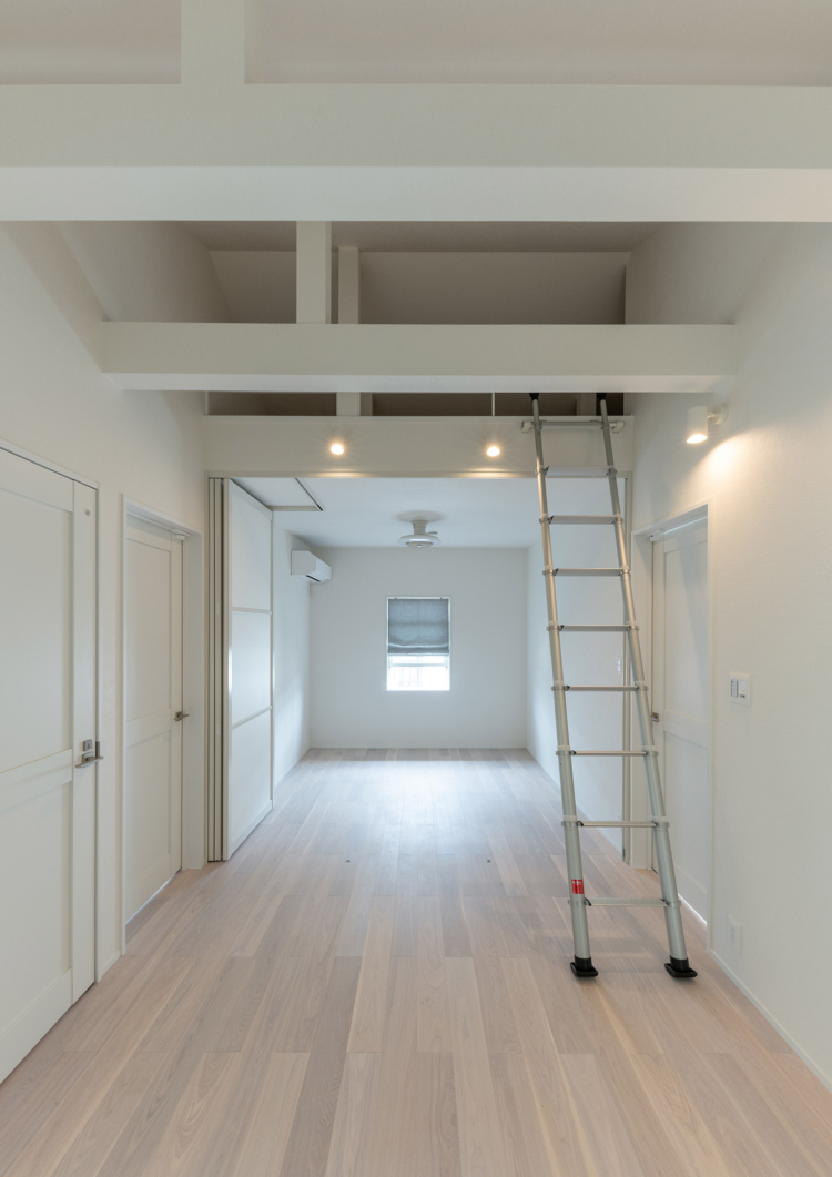 2階は、フロアレベルを調整して段差をなくしています。その代わり、天井を抜いて小屋裏をオープンなロフトにして梁をみせることで、広さを感じさせる作りとしました。ご夫婦それぞれの部屋の間には、間仕切り壁を設置。オープン時には壁に沿って収納でき、セカンドリビングとして広く使い、ゲストが来た時には部屋として仕切れるようになっています。