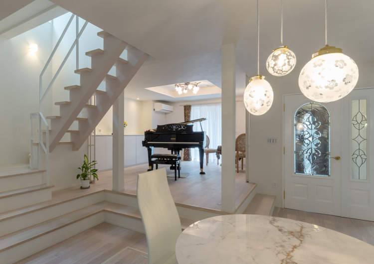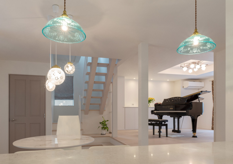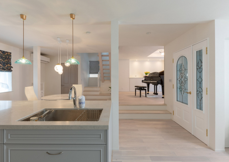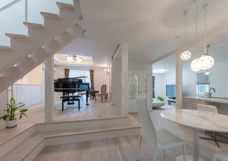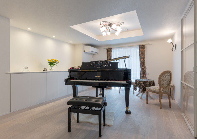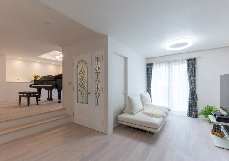 リノベーションで頂いたご要望は、グランドピアノを置ける空間とアイランドキッチン、ご夫妻それぞれの居室を設けたいということでした。そこで、解消が難しい段差を活かし、ステージのように見立てたオープンなピアノ室を設け、ガラス扉でシチュエーションに合わせ間仕切ることが出来るようにしています。