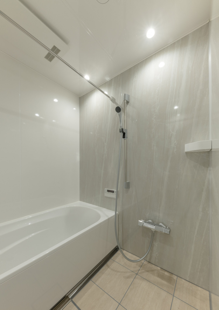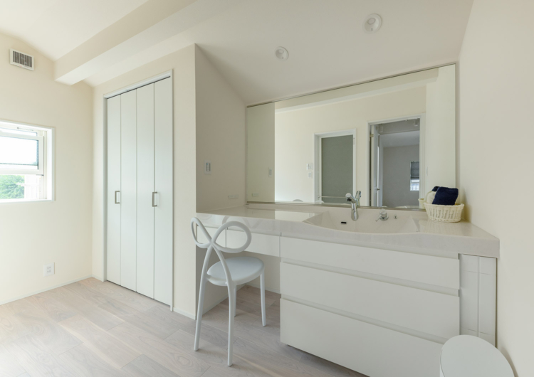 脱衣室兼ランドリースペースは、室内干し用のハンガーパイプや、身支度用に座れるようにするなど、ライフスタイルに合わせて、広く柔軟性のある空間に仕上げました。