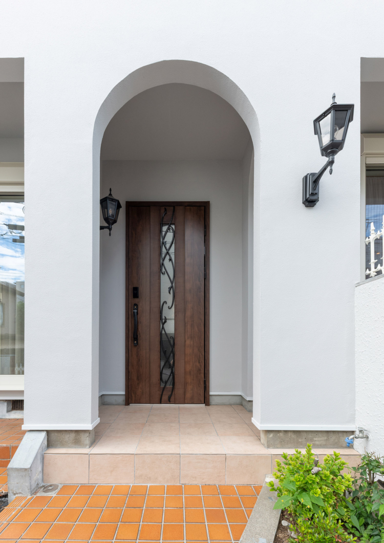 外観は、玄関先をあえてアーチで囲みブラケット照明を設置。2階のバルコニーは、それぞれの部屋で独立していたものを解体して、床の高さを揃え各部屋を繋ぐ広いバルコニーに作り変えました。