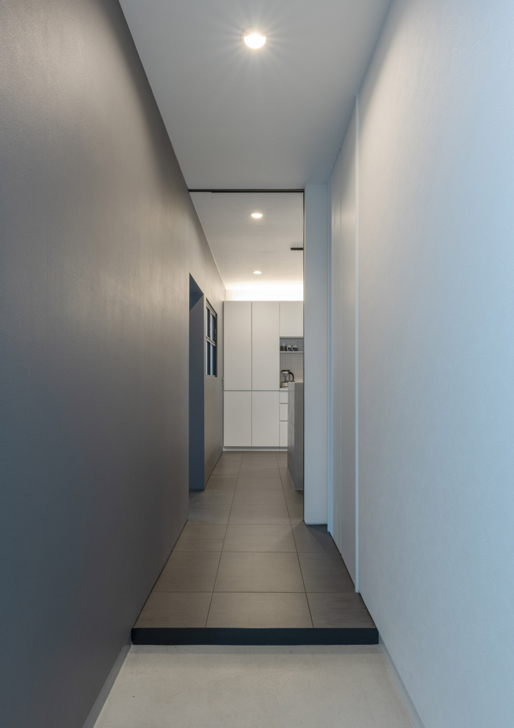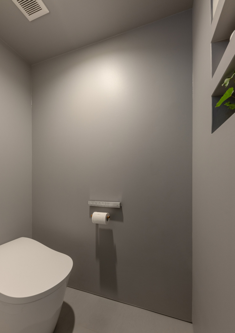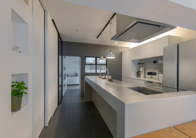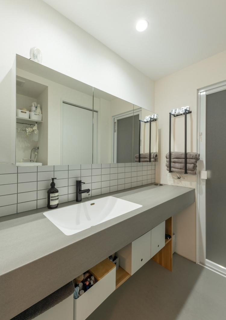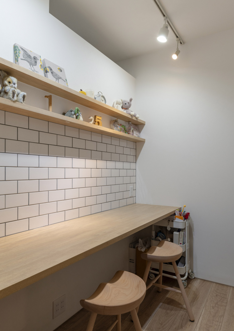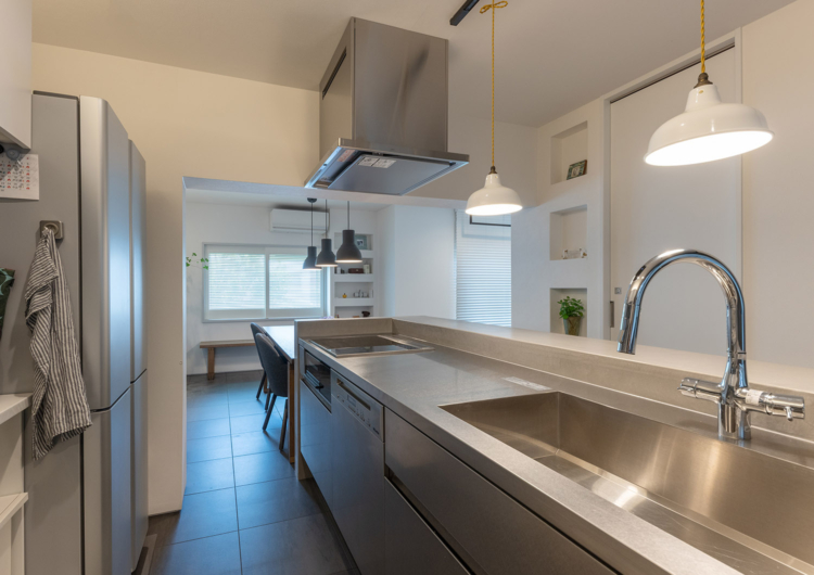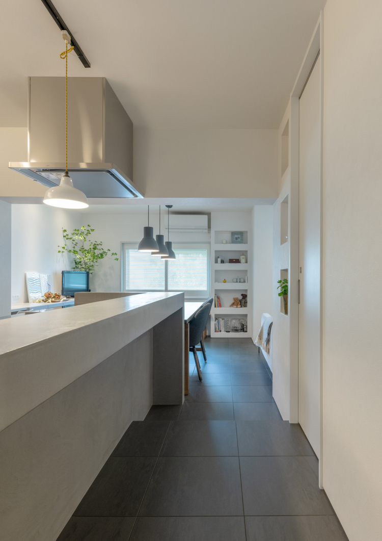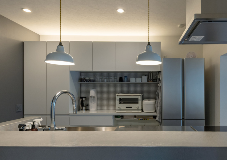 家の中心となる玄関から近い場所に、大きなキッチンを配置のご提案をしました。しかし、キッチンを既存位置から大きく移動させるには、壁式構造ならではの弊害があり、床を上げる必要がありました。そこで、全体を上げるのではなく、一部だけ上げることで天井高を確保し空間全体に圧迫感が出ない様に工夫しています。デザインはミラタップのステンレキッチンを採用し、スタイリッシュながら日々の掃除のしやすいモデルを採用。正面はカウンターを造作しモールテックス(左官)にて仕上げています。背面のカップボードはセミオーダー収納のミリスタイルで、上部にコーブ照明(間接照明)を設置しこだわりのキッチン空間に仕上げました。