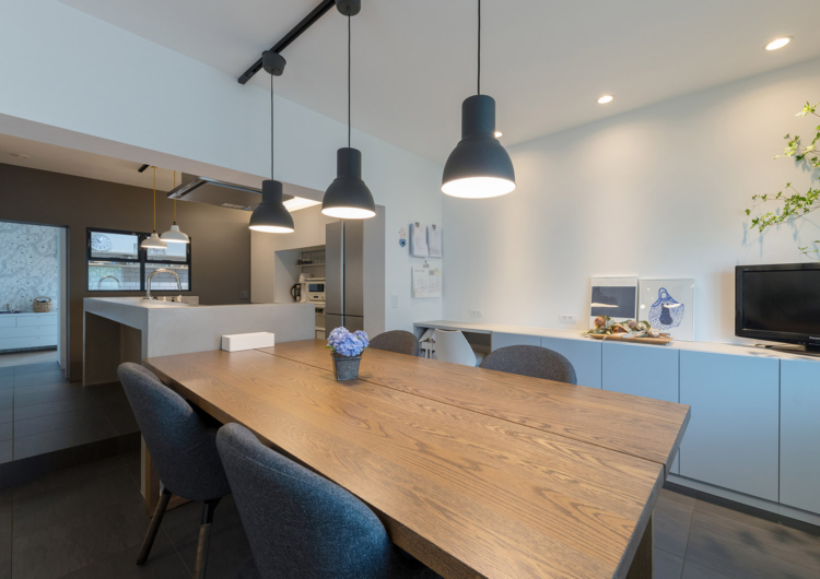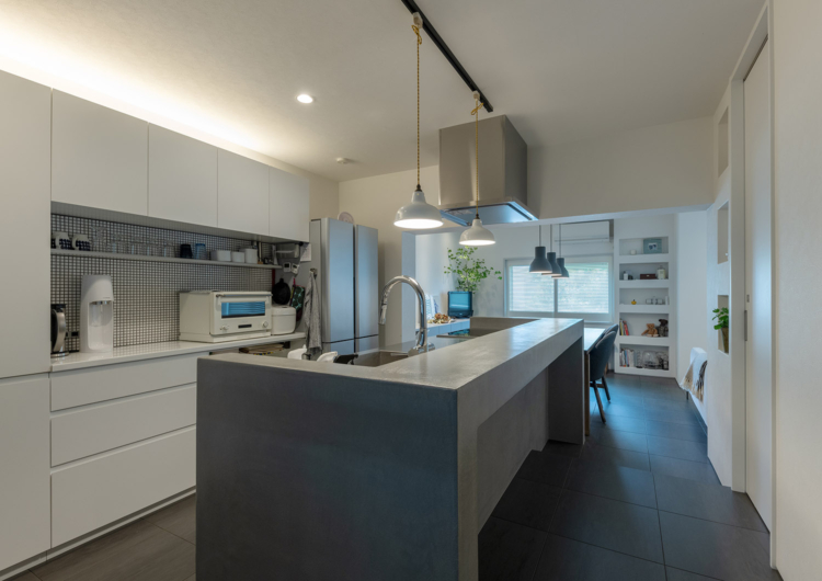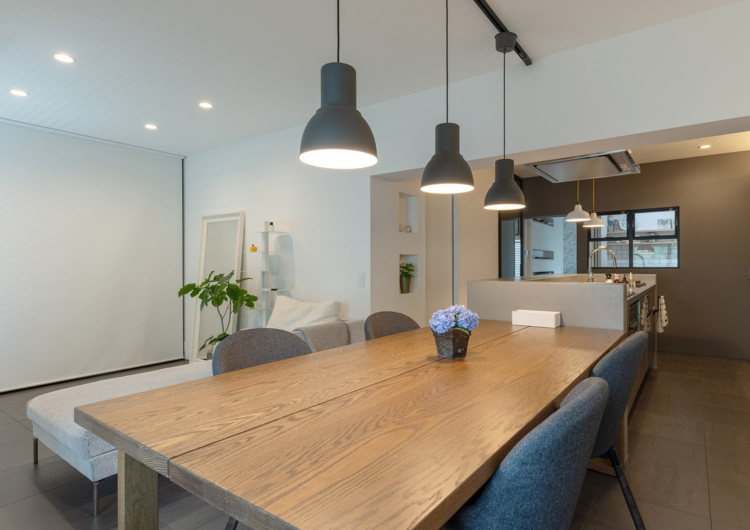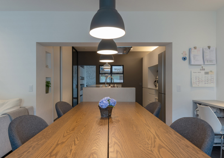 キッチンを抜けると、そのままの流れでリビング・ダイニングへと動線が誘導されるような計画になっており、プライバシーに配慮しつつも、家族が互いに存在を感じられるようになっています。ご友人が来られた際にも、キッチンがコミュニケーションの中心になり、自然と人が集まる空間になっています。
