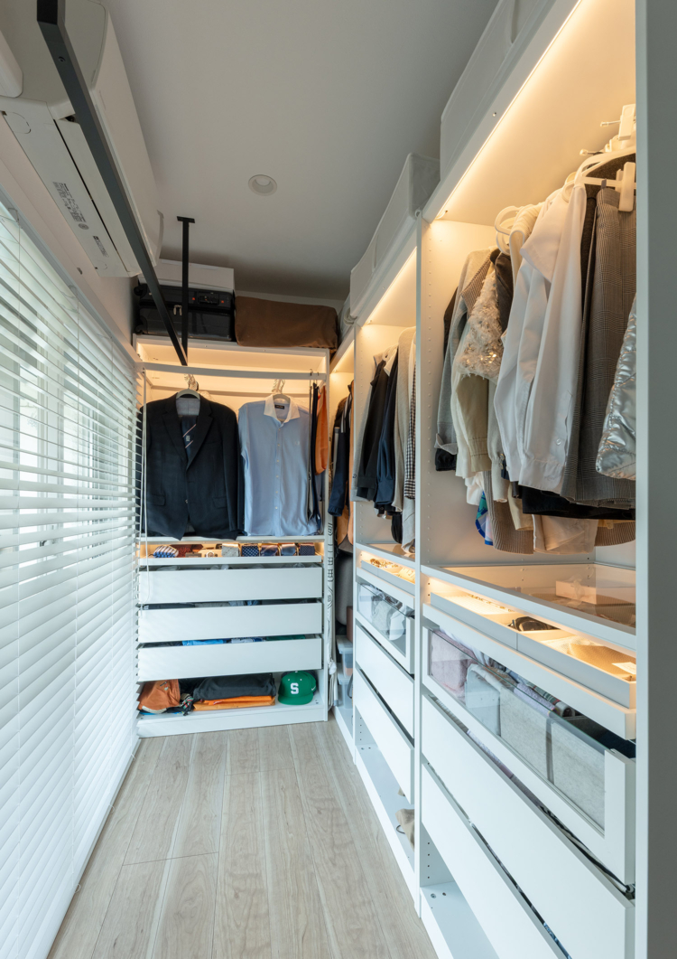収納空間は、お手持ちの収納棚や造作の収納を上手く組み合わせました。こちらのお宅で特徴的なの収納庫のような扉付きの箇所が無いことです。空間をフル活用できるように、扉で仕切るのではなく、様々なメーカーのアイテムや造作家具の収納を設置しています。