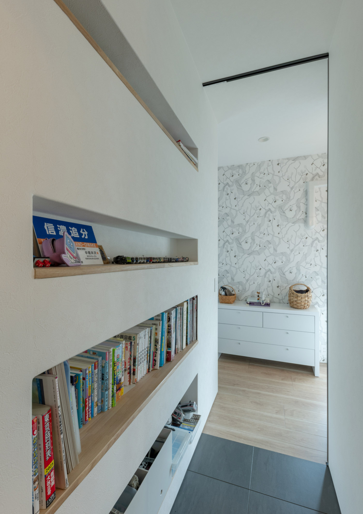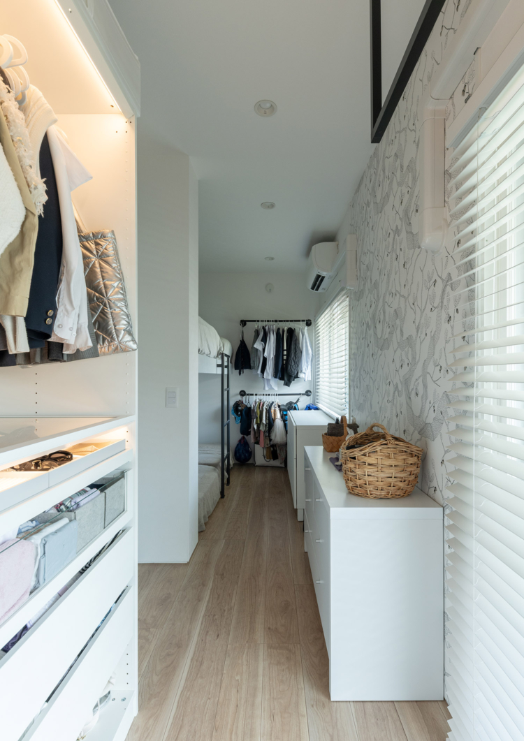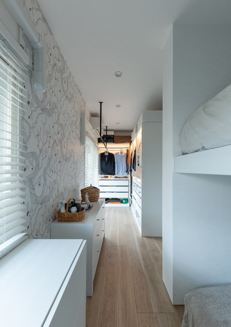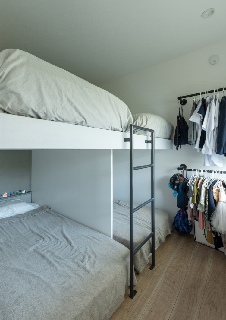 約67㎡と限られた空間の中で、高いプライバシー性が求められる家族の寝室は、珍しい2段ベットのスペースになっています。将来的にお子様が一人立ちされても、広い就寝スペースや収納として活用できるように計画しました。