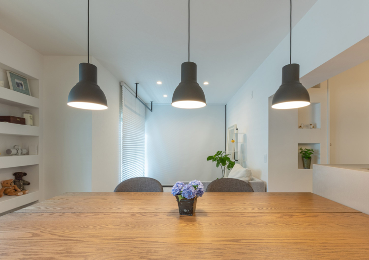 ダイニング後ろの腰高収納はリクシルのヴィ―タスを採用。同じダイニング空間には見せるニッチ収納を大工さんに作ってもらいました。リビングでは、写真ではわかりづらいですが、ロールスクリーンの先はピアノが隠されていて、他にも収納ができるようになっています。