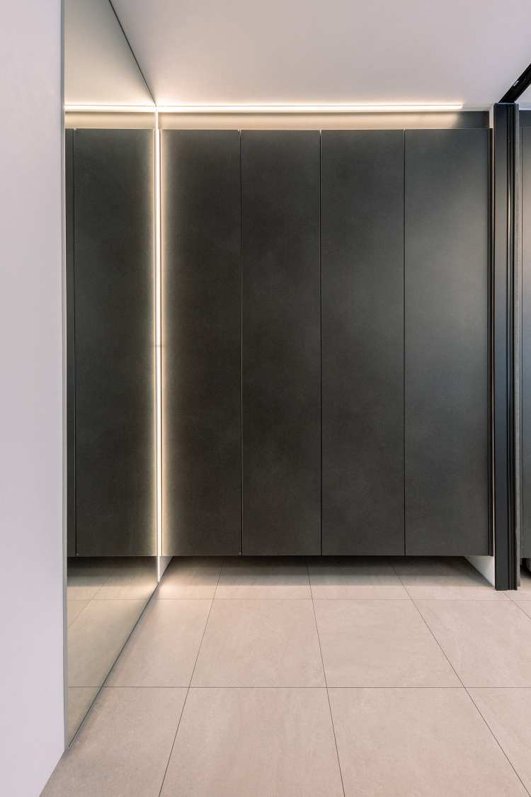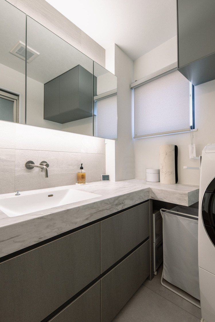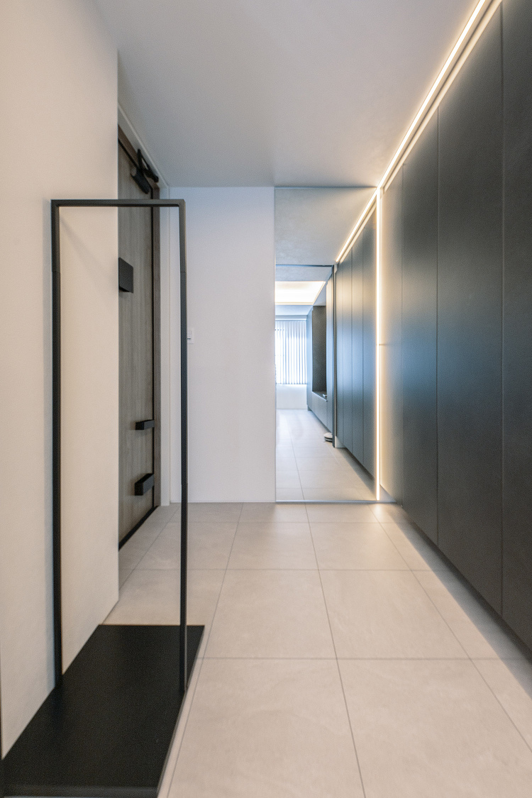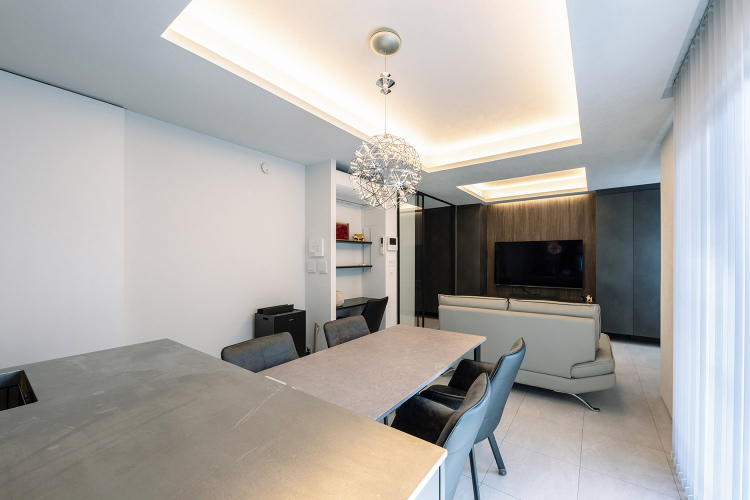 そこでご提案したのが、玄関収納からリビングのTV周り収納までを、同色で連続性を持たせアクセントウォールのように見えるようレイアウトしました。さらに玄関からのリビング戸はガラスの間仕切りにすることで、開放性と連続性の強調や、間接照明を取り入れるにあたり梁型をみせて天井高さを確保するなど、広く感じられる空間デザインに仕上げています。