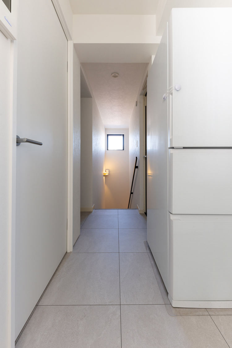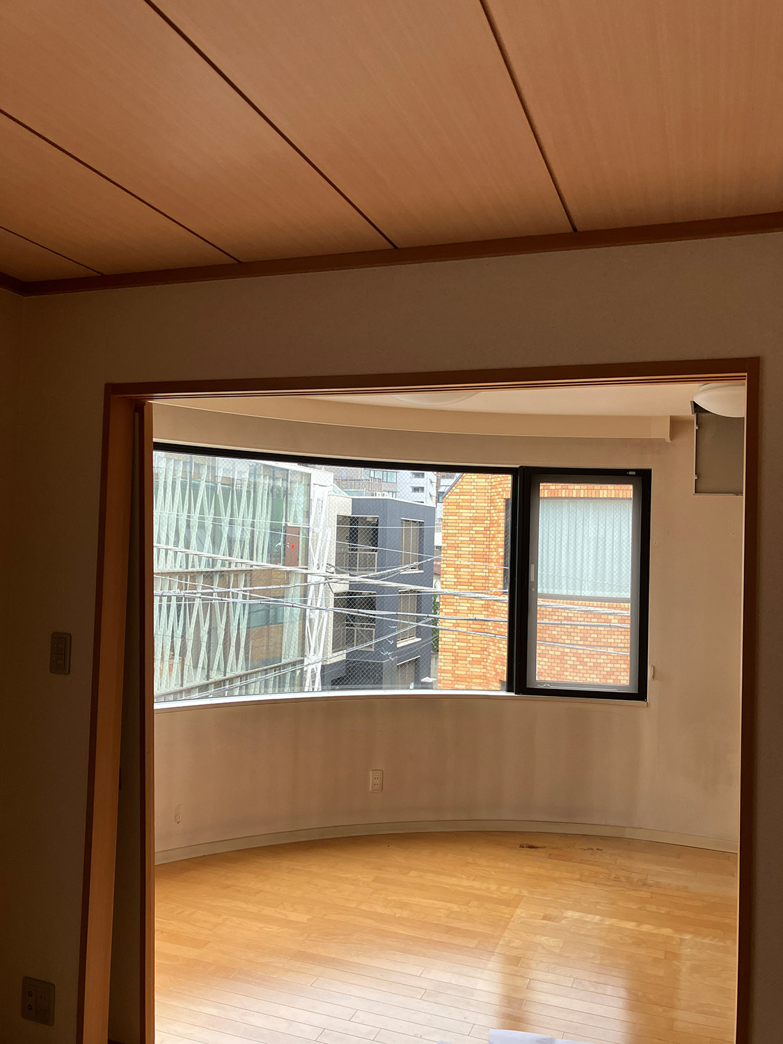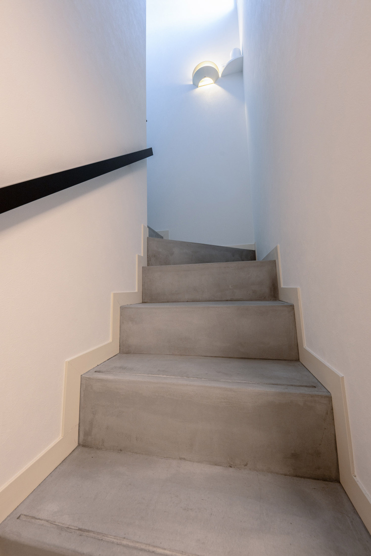 今回リノベーションした建物は、Rの外壁がポイントになっており、住戸内でも緩やかなカーブを描いた空間が特徴です。また、メゾネットタイプのため、ワンフロアは比較的コンパクトな印象を受ける住宅でした。